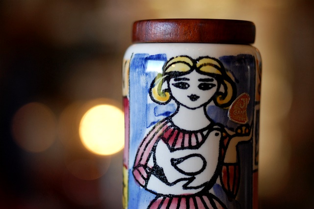 同時期の木の蓋の付いたハンドペイントでカラフルに描かれた調味料入れやキャニスターも人気のアイテム。