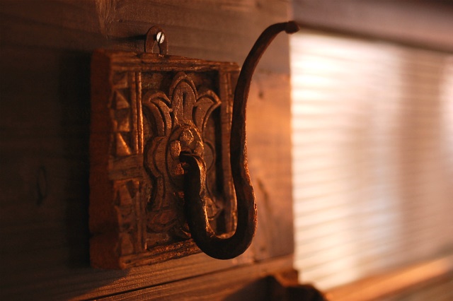 穴の開いた鉄の金具がマイナスネジでついており、吊り下げて使うようになっています。