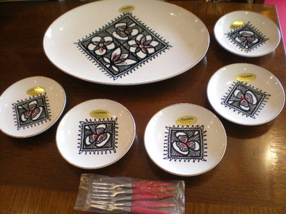 こちらはメインの大皿と取り皿が5枚、そして何とも昭和レトロなフルーツフォークが5本付いています。