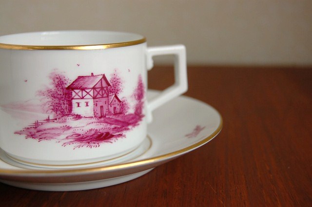 白磁に紫の葡萄色(ヘキストの基本色)一色でノスタルジックに描かれたライン川の風景、