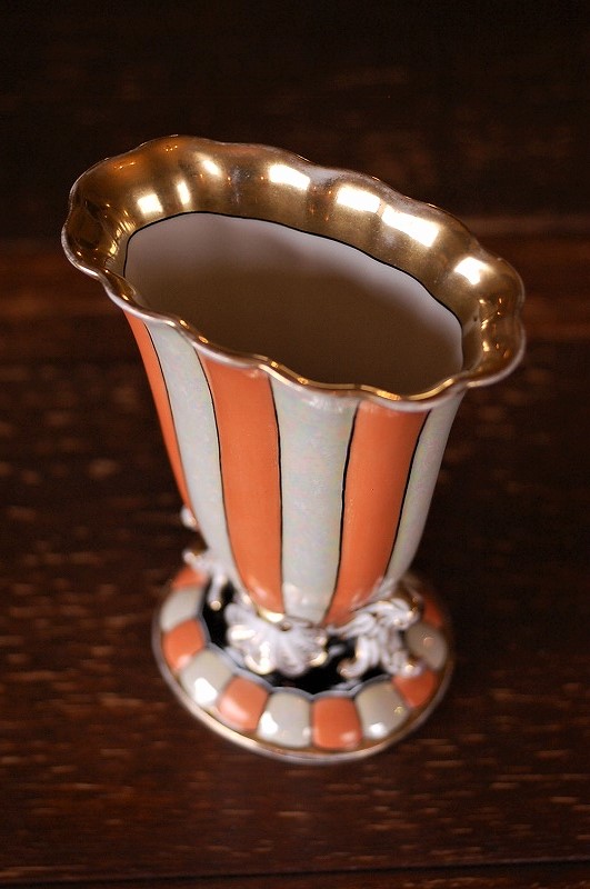 オレンジ、白のストライプ柄ラスター彩とゴールドのコントラストが素晴らしいですね。